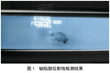 某干線輸氣管道長136 km,管徑914 mm,壁厚16 mm,設(shè)計(jì)壓力9.2 MPa, 2015年1月投產(chǎn)。在首輪內(nèi)檢測中發(fā)現(xiàn)檢測里程39 048.81 m處,順氣流8:00方向,存在金屬損失39% wt的缺陷,剩余壁厚9.76 mm,管道缺陷嚴(yán)重。采用噴灑方式進(jìn)行磁粉檢測未發(fā)現(xiàn)裂紋,超聲測厚實(shí)測的最大減薄為40.6%,射線檢測結(jié)果顯示為內(nèi)部金屬損失,如圖 1所示。