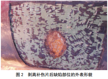 現(xiàn)場觀察,管道缺陷部位3PE防腐層存在補(bǔ)傷痕跡,將補(bǔ)傷片剝離后,管道缺陷部位外表面凹凸不平且外表面熔結(jié)環(huán)氧粉末涂層缺失,如圖 2所示。