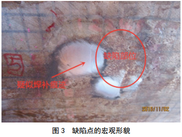 在缺陷對應(yīng)位置選取2~3個區(qū)域進(jìn)行輕微研磨、拋光,用硝酸乙醇進(jìn)行腐蝕,進(jìn)一步觀察宏觀形態(tài)。如圖 3所示,缺陷點(diǎn)表面色澤光亮,未見裂紋、腐蝕坑等缺陷,但管道表面存在明顯的分界線,疑似焊補(bǔ)痕跡。