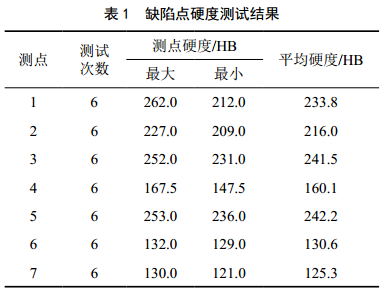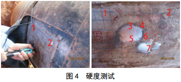 在管道外表面缺陷點(diǎn)疑似焊補(bǔ)部位和其余部位分別取樣,如圖 4所示。用Equotip-Piccolo2型便攜式里氏硬度計(jì)進(jìn)行表面硬度測試[3],結(jié)果如表 1所示。