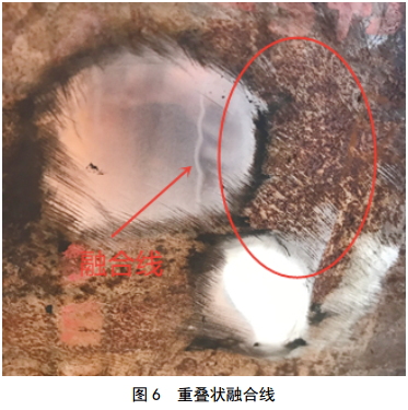 結(jié)果可知,管道母材的金相組織均為鐵素體,呈帶狀分布,晶粒細(xì)小,如圖 5(a)(b)所示;熱影響區(qū)靠近母材一側(cè)為重結(jié)晶區(qū),晶粒相當(dāng)細(xì)小,而靠近熔合區(qū)一側(cè)組織略微粗大,如圖5(c)所示;熔合區(qū)組織為針狀鐵素體,且晶粒比較細(xì)小。如圖 5 (d)所示。此外,缺陷點(diǎn)宏觀鏡面形貌存在明晰可辨的反復(fù)堆焊的重疊狀融合線,進(jìn)一步表明缺陷外表面歷經(jīng)焊補(bǔ)操作,如圖 6所示。