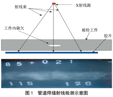 天然氣管道射線檢測常用射線照相法,即用X射線或γ射線穿透試件,以膠片作為記錄信息的無損檢測方法。如圖 1所示。