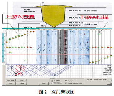 (2) AUT檢測。采用相控陣技術(shù),只使用一對相控陣探頭(一般為60陣列,相當于60個常規(guī)探頭),完成A掃描、 B掃描、 TOFD(超聲波衍射時差法)及聲耦合顯示缺陷方法。其中, A掃描,負責檢測焊縫坡口面上的面積型缺陷; B 掃描,負責檢測焊縫體積型缺欠; TOFD掃描負責檢測盲區(qū)的缺陷。管道檢測雙門帶狀圖如圖 2所示[3]。
