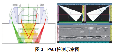 (3) PAUT檢測。使用微型探頭陣列產(chǎn)生超聲波束,通過建立聚焦規(guī)則使電子裝置控制每個陣列單元的發(fā)射和接收時間,從而產(chǎn)生出多個超聲波束,通過控制陣列的激發(fā)和接收時間,控制波束角度、聚焦深度、聚焦尺寸等,實現(xiàn)工件的快速掃描成像,如圖 3所示。
