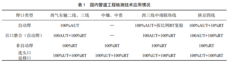 3.1 國內(nèi)管道工程檢測技術(shù)應(yīng)用情況(表 1)