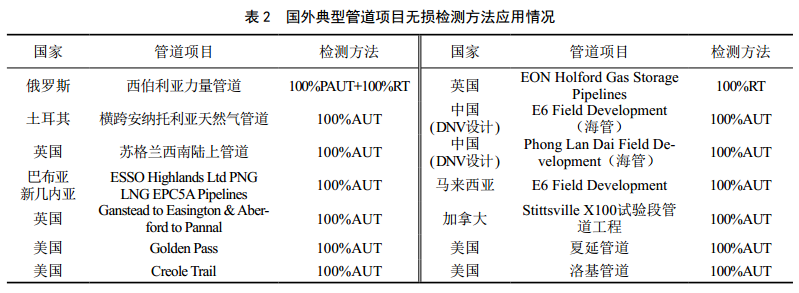 3.2 國外典型管道項目無損檢測方法應(yīng)用情況(表 2)