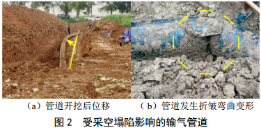 采空塌陷區(qū)內(nèi)的管道由于受到擠壓、拉拽,經(jīng)常出現(xiàn)位移、翹曲,嚴(yán)重時(shí)發(fā)生彎曲變形,管道本體出現(xiàn)褶皺變形(圖 2),嚴(yán)重時(shí)造成管道拉裂、爆炸、輸氣中斷等,影響居民生活和企業(yè)生產(chǎn)。如2018年1月,山西三晉天然氣長(zhǎng)輸管道(長(zhǎng)子縣-長(zhǎng)治縣段)受采空區(qū)地表沉陷影響,造成管道局部地段應(yīng)力發(fā)生變化,管道被拉裂漏氣,導(dǎo)致長(zhǎng)治市短時(shí)間內(nèi)供氣量減少32萬(wàn)立方米。