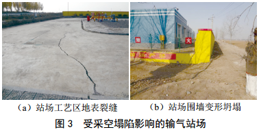 采空塌陷范圍內(nèi)地表被拉裂,形成拉張裂縫,同時(shí)由于差異性沉降,地面形成錯(cuò)臺(tái)。位于塌陷區(qū)輸氣 站場(chǎng)多形成裂縫,工藝管道受不同方向作用力而發(fā)生應(yīng)力集中,影響運(yùn)行安全;輸氣站場(chǎng)內(nèi)的建筑物、圍墻等受拉力、剪切力的作用,墻體出現(xiàn)裂縫甚至坍塌(圖 3)。