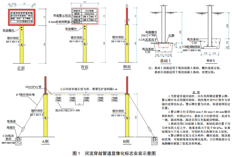 當(dāng)管道穿越中小型河流時(shí),在河道兩側(cè)設(shè)置河流穿越管道顯像化標(biāo)志及配套警示牌,代替原有標(biāo)志樁及警示牌,并將原有樁牌移除。顯像化標(biāo)志及配套警示牌安裝在河流和渠道堤壩穩(wěn)定、不易受到洪水沖刷的位置。