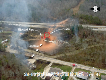 2012年12月11日,美國(guó)Columbia公司運(yùn)營(yíng)的SM-80州際天然氣管道在西弗吉尼亞州西森維爾鎮(zhèn)附近發(fā)生斷裂著火事故,造成多處房屋受損,距離事故點(diǎn)30米的77號(hào)公路的瀝青路面受損、交通長(zhǎng)時(shí)間中斷。事故原因和暴露的問(wèn)題主要包括:外腐蝕沒(méi)有得 到有效控制,防腐層破損、回填石塊屏蔽陰極保護(hù)電流造成管道外壁發(fā)生嚴(yán)重腐蝕,最終導(dǎo)致韌性斷裂;未充分識(shí)別管道失效對(duì)附近公路的影響,未將事故管段納入完整性管理程序。