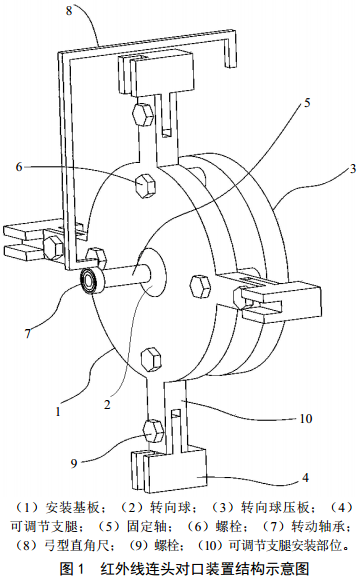 紅外線連頭對口裝置由安裝基板、轉向球、轉向球壓板和可調節(jié)支腿組成(圖 1)。四個可調節(jié)支腿等間距裝在圓形安裝基板四周。安裝基板與轉向球壓板之間設置有小孔,轉向球安裝在兩者之間,用螺栓連接。固定軸一端放置紅外線發(fā)射或接收器,另一端連接轉向球。固定軸內部安裝轉動軸以使得其上連接的弓型直角尺可以通過旋轉劃線。