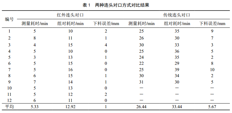 現(xiàn)場使用時,首先將紅外連頭對口裝置安裝在兩段長輸管道管口的圓心處,紅外線發(fā)射器與安裝在另一端管道的紅外線接收器相對。調整轉向球使紅外線直接照射在接收器上,固定紅外線發(fā)射器和接收器,使兩端管道管口圓心處在同一條直線上。分別在兩端管道使用弓型直角尺畫出切割標記線,標記線圍成的圓形平面與紅外線相垂直,測量兩個平面之間的距離,即得出下料長度。該裝置經(jīng)揭陽維搶修隊用于DN 800閩粵支干線工程和揭陽分輸站改擴建工程中,與傳統(tǒng)連頭對口測量方式對比(表 1),結果表明,使用該裝置能夠降低下料誤差,明顯縮短施工時間。