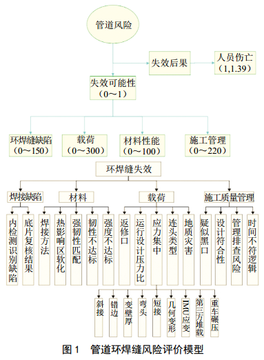 中緬天然氣管道環(huán)焊縫風(fēng)險評價采用半定量方法(圖 1),將影響管道環(huán)焊縫可靠性的13個指標分為環(huán)焊縫缺陷、載荷、材料性能和施工管理四類,并分析各個指標之間的邏輯關(guān)系,對每個指標進行賦值評分,綜合評價其引起管道泄漏的可能性;對于高后果區(qū)內(nèi)的環(huán)焊縫,以不同的安全系數(shù)來表示泄漏事故后果的嚴重程度,將上述分值與安全系數(shù)相乘,最終得到管道沿線的風(fēng)險大小。