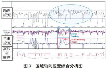 隨著內(nèi)檢測技術(shù)發(fā)展,軸向應(yīng)變檢測功能也逐步普及,檢測器上還可加入IMU模塊定位管道坐標。日后的開挖驗證選口可以根據(jù)檢測結(jié)果劃定的軸向應(yīng)變和彎曲應(yīng)變集中區(qū)域(圖 3),組織對應(yīng)力較大的環(huán)焊縫開挖驗證;也可以根據(jù)IMU數(shù)據(jù)與竣工中心線數(shù)據(jù)進行對比分析和確定管道位移變化情況,進一步驗證軸向應(yīng)變內(nèi)檢測結(jié)果的準確性。