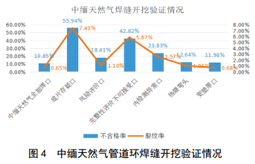 結(jié)合中緬天然氣管道內(nèi)檢測數(shù)據(jù)對齊成果,對發(fā)現(xiàn)的較嚴重及以上異常環(huán)焊縫組織開挖驗證,發(fā)現(xiàn)不合格焊口占比達到24.61%,裂紋口率為2.36%,不合格率約為平均值的2.5倍,說明內(nèi)檢測數(shù)據(jù)也具有一定的參考價值。