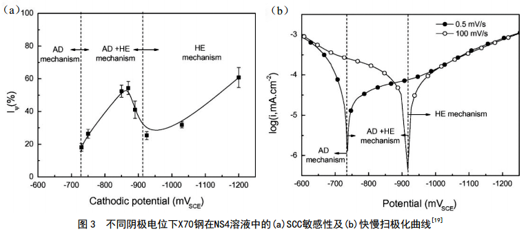 由于TGSCC是中高強(qiáng)度鋼氫脆斷裂的典型特征,而近中性pH介質(zhì)中能進(jìn)行析氫反應(yīng),因此早期許多研究人員將近中性pH-SCC歸因于HE機(jī)制。但是該觀點(diǎn)最終未形成統(tǒng)一認(rèn)識(shí),因?yàn)閷?shí)際近中性pH SCC環(huán)境中難以達(dá)到足夠的充氫條件。同時(shí),由于在裂紋萌生階段能觀察到局部腐蝕促進(jìn)裂紋萌生現(xiàn)象,因此,也有很多研究者認(rèn)為其為AD機(jī)制。但單純AD機(jī)制無法解釋TGSCC現(xiàn)象。因此有觀點(diǎn)認(rèn)為氫可能通過促進(jìn)陽極溶解而促進(jìn)SCC[3]。