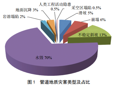 根據(jù)2020年分公司開展汛前地災(zāi)普查和汛期巡查工作成果,管道沿線各類地災(zāi)隱患的類型及占比見圖 1。