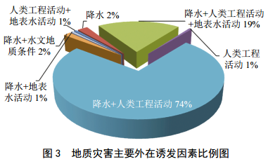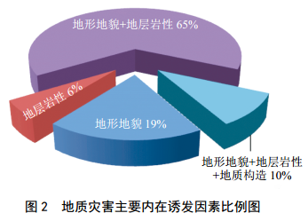 (2)地質(zhì)災(zāi)害誘發(fā)因素。分為內(nèi)在影響因素和外在誘發(fā)因素。通過對(duì)管道沿線地災(zāi)隱患發(fā)育情況和地質(zhì)環(huán)境條件情況調(diào)查分析,主要內(nèi)在影響因素有:地形地貌條件、地層巖性條件、地質(zhì)構(gòu)造條件等;主要外部誘發(fā)因素有:降水、人類工程活動(dòng)、水文地質(zhì)條件和地表水活動(dòng)等。地質(zhì)災(zāi)害的發(fā)生多數(shù)情況下由多個(gè)內(nèi)因或外因共同作用,見圖 2和圖 3。根據(jù)統(tǒng)計(jì)結(jié)果,地災(zāi)隱患內(nèi)在因素以地形地貌+地層巖性的組合因素最為普遍,其次受地形地貌內(nèi)在因素的控制。