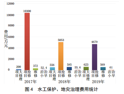 針對(duì)地質(zhì)災(zāi)害數(shù)量多、成災(zāi)頻繁等特點(diǎn),以專業(yè)排查、日常巡查為地災(zāi)防治的常態(tài)化有效識(shí)別機(jī)制,對(duì)排查、巡查出的地災(zāi)隱患點(diǎn),開展治早治小、工程治理、專業(yè)監(jiān)測、應(yīng)急搶險(xiǎn)等針對(duì)性處置。在汛期由專業(yè)地質(zhì)人員進(jìn)駐管道沿線,參與日常巡查,對(duì)發(fā)現(xiàn)的地災(zāi)隱患及時(shí)分析其穩(wěn)定性、危險(xiǎn)性,同時(shí)提出處置措施。據(jù)2017年—2019年分公司三年水工保護(hù)、地災(zāi)治理費(fèi)用統(tǒng)計(jì)分析(圖 4),可以看出: