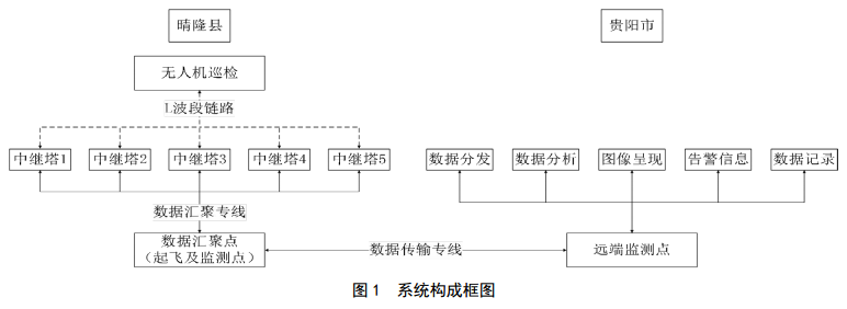 數(shù)據(jù)匯聚點(diǎn)為設(shè)備提供了展開(kāi)撤收、臨時(shí)搭建和應(yīng)急運(yùn)營(yíng)的現(xiàn)場(chǎng)實(shí)施環(huán)境,同時(shí)滿足無(wú)人機(jī)維護(hù)及起飛等需求。在晴隆縣境內(nèi)中緬天然氣管道南北兩側(cè),結(jié)合實(shí)際地形、海拔、通視條件等因素,每隔約12公里均勻散落分布五座信號(hào)中繼塔。中繼塔選擇就近地勢(shì)相對(duì)較高的鐵塔公司為電信運(yùn)營(yíng)商提供基站專用塔,并在頂端架設(shè)帶有全向天線的20公里軍品級(jí)數(shù)據(jù)鏈。中繼終端采用軍品級(jí)L波段鏈路與無(wú)人機(jī)無(wú)線通訊和中繼接力。從無(wú)人機(jī)上電自檢開(kāi)始,鏈路會(huì)自主選擇相對(duì)信號(hào)較強(qiáng)的中繼鏈路作為主要通信設(shè)備,同 時(shí)接收可以握手的其他鏈路設(shè)備,當(dāng)飛行距離較遠(yuǎn),當(dāng)前通信用數(shù)據(jù)鏈信號(hào)質(zhì)量滑落時(shí),自動(dòng)切換至下一個(gè)信號(hào)較強(qiáng)的數(shù)據(jù)鏈。在塔上搭載的五個(gè)數(shù)據(jù)鏈通過(guò)專用數(shù)據(jù)網(wǎng)絡(luò)將數(shù)據(jù)統(tǒng)一匯聚至數(shù)據(jù)匯聚點(diǎn),完成對(duì)無(wú)人機(jī)的遠(yuǎn)程測(cè)控。