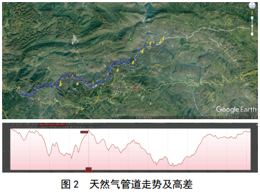 管道走勢(shì)大致呈東西向排列,走勢(shì)高度起伏不定,最大高差在1500米左右(圖 2)。中繼塔選擇相對(duì)地勢(shì)較高的山頂(圖 3)。
