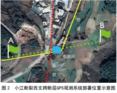 小江西支斷裂帶為南北走向,為了監(jiān)測該斷裂帶斷裂兩側(cè)相對活動量,將GPS觀測站設(shè)計為跨斷層監(jiān)測,地址選在小碑當(dāng)村南部,管道從西邊過來往北轉(zhuǎn)彎處。