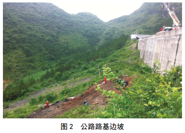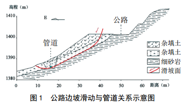 (3)國(guó)內(nèi)南丹縣某成品油管道時(shí)隔兩年在同一區(qū)域發(fā)生兩次破裂漏油事故,事故地點(diǎn)位于山區(qū)某長(zhǎng)距離緩坡地帶,在新建高速公路路基棄渣和軟弱下臥層地質(zhì)共同作用下,管道沿線坡體向下緩慢蠕滑造成事故發(fā)生。公路路基邊坡如圖 2所示。