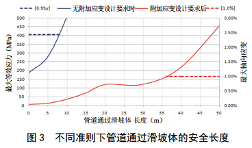 不穩(wěn)定斜坡風(fēng)險(xiǎn)形成的位移載荷具有自限性,類似的載荷為穿越斷層的位移載荷,但與穿越斷層不同的是,坡體失穩(wěn)發(fā)生的位置及形態(tài)更具不確定性。借鑒穿越活動(dòng)斷層段管道設(shè)計(jì)經(jīng)驗(yàn),通過(guò)一系列技術(shù)措施可提高管道承受附加土體位移載荷的能力。在山區(qū)管道沿線不穩(wěn)定斜坡風(fēng)險(xiǎn)較高地段,可改變管道設(shè)計(jì)準(zhǔn)則,以應(yīng)變?yōu)闇?zhǔn)則來(lái)增強(qiáng)相應(yīng)風(fēng)險(xiǎn)承載能力。以上述外徑559 mm管道為例,在考慮附加技術(shù)措施后管道允許應(yīng)變能力可以達(dá)到1%,管道承載土體位移變形能力可得到較大改觀。通過(guò)滑坡體的安全長(zhǎng)度從6 m增至35 m,如圖 3所示,有效提高了管道在該類風(fēng)險(xiǎn)發(fā)生時(shí)的承載能力,可為后續(xù)應(yīng)對(duì)或應(yīng)急贏得時(shí)間。
