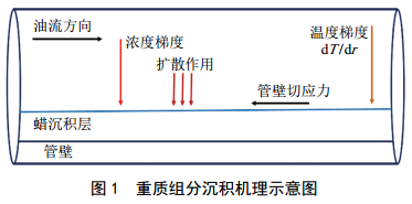 首先需要建立山地管道重質(zhì)組分沉積預(yù)測模型。重組分的沉積過程是多種機(jī)理混合作用的結(jié)果,其中分子擴(kuò)散、油流剪切和老化作用對輸油管道中重組分沉積層的形成有較大影響,重質(zhì)組分沉積的物理模型如圖 1所示。