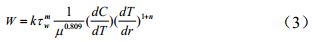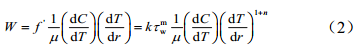 黃啟玉模型以分子擴(kuò)散機(jī)理為基礎(chǔ),同時考慮到了紊流狀態(tài)下流體對蠟沉積層的剪切作用,是一種具有普適性的蠟沉積動力學(xué)模型。他認(rèn)為剪切彌散對蠟沉積的影響基本可以忽略。該模型中提出了“蠟沉積傾向系數(shù)”的概念,該系數(shù)考慮了管壁剪切應(yīng)力和管道徑向溫度梯度的影響。同時其他不確定因素,如蠟分子擴(kuò)散系數(shù)等,一并計入系數(shù)中,簡化了計算步驟。蠟沉積傾向系數(shù)的表達(dá)式為: