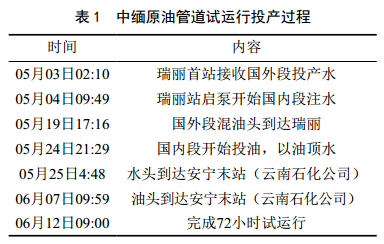 中緬原油管道(國內(nèi)段)自2017年5月3日瑞麗首站注水,至6月7日油頭到達安寧末站(云南石化公司), 6月12日完成72小時試運行和相關(guān)測試,管道一次性投產(chǎn)成功,投產(chǎn)總用時35天。投產(chǎn)過程詳見表 1。
