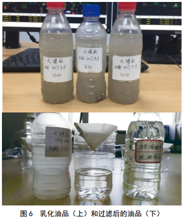 據(jù)此,大理站開展現(xiàn)場實驗,使用濾紙過濾乳化油品,乳化現(xiàn)象明顯消除(圖 6)。根據(jù)實驗結(jié)果,建議下游銷售公司將罐內(nèi)油品靜置5~7天,乳化現(xiàn)象基本消除。