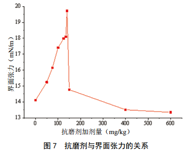 為了定量分析抗磨劑對柴油乳化成因,開展了相關(guān)研究。從圖 7可以看出,投產(chǎn)所用柴油的界面張力隨著抗磨劑加入量的增加,先升高后降低,界面張力最大點處正是實際管輸柴油中抗磨劑加入量處。