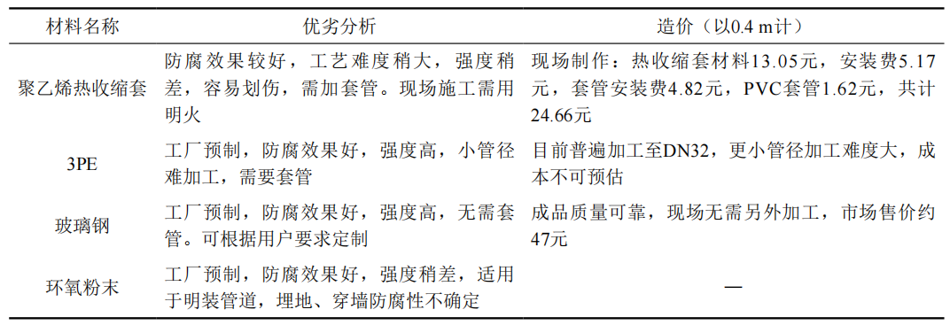穿墻、穿樓板位置燃氣管道腐蝕漏氣主要集中在入戶管穿廚房外墻和表后管穿生活陽臺墻壁等處, 目前管道防腐多采用施工現(xiàn)場制作工藝,對施工人員技能要求較高。如穿墻位置的燃氣管道防腐長度為30 ㎝左右,冷纏防腐膠帶6~8圈,兩端無固定。冷纏防腐膠帶的黏性與溫度有較大的關(guān)系,經(jīng)歷冬季后會慢慢松動甚至脫落,使防腐性能下降,因雨水、水蒸氣等進入后造成點蝕漏氣。比較不同材料常用防腐工藝優(yōu)劣,選擇以玻璃纖維增強塑料(玻璃鋼)為預(yù)防腐層的新型預(yù)制防腐管件,詳見表 2。