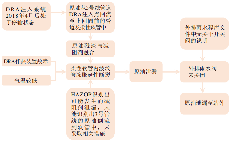 HAZOP將DRA伴熱裝置故障識(shí)別為工藝危害,可能情形為DRA注入系統(tǒng)及管道(包括19 mm柔性編織軟管)暴露在低溫下,管道或柔性編織軟管會(huì)發(fā)生凍結(jié)形成阻塞流而過壓,導(dǎo)致DRA介質(zhì)泄漏。但HAZOP并未識(shí)別出DRA注入系統(tǒng)的設(shè)計(jì)是否允許原油從注入點(diǎn)回流到止回閥,也未識(shí)別出如果包括柔性編織軟管在內(nèi)的管道凍結(jié)和破裂,可能會(huì)導(dǎo)致原油泄漏。因此,未采取任何控制措施。