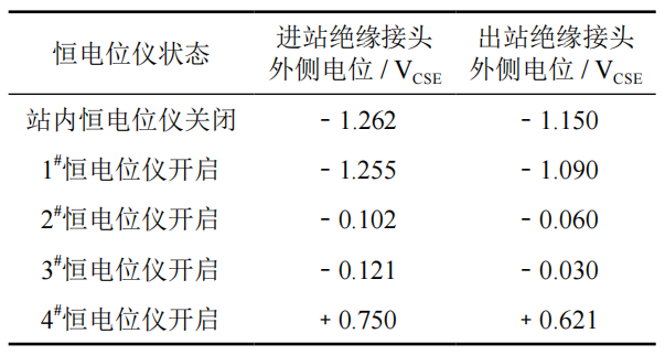 逐個(gè)開啟站內(nèi)恒電位儀,測試進(jìn)出站絕緣接頭外側(cè)電位,分析治理措施實(shí)施后區(qū)域陰極保護(hù)系統(tǒng)對(duì)站外管道的雜散電流干擾情況,測試結(jié)果見表 4。在開啟站內(nèi)4路恒電位儀時(shí),進(jìn)出站管道的電位變化不明顯,表明采用分布式淺埋陽極對(duì)干線管道的干擾影響小。