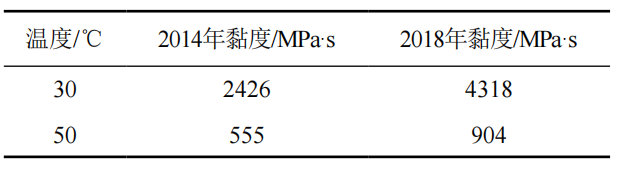 從表 2可以看出,吉七稠油30℃油品黏度2018年比2014年增大約0.7倍,混油黏度明顯增高。