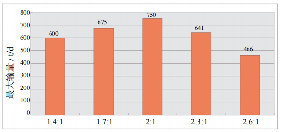 外輸管線(xiàn)出站壓力2.5 MPa,進(jìn)站壓力0.12 MPa,出站溫度65℃,地溫3℃,北十六原油和致密油處于穩(wěn)產(chǎn),產(chǎn)量分別為200 t/d和50 t/d。模擬計(jì)算結(jié)果表明,現(xiàn)役管道條件下,吉七稠油摻混比為2∶1時(shí),最大輸量達(dá)到峰值750 t/d,其中吉七稠油最大混油量為500 t/d;繼續(xù)增加吉七稠油摻混比將導(dǎo)致其外輸能力下降(圖 3)。