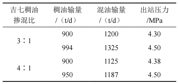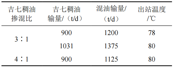 (2)現(xiàn)役管道外輸混油時(shí)吉七稠油最佳摻混比為2:1,出站壓力2.5 MPa,出站溫度65℃,最大混油輸量為750 t/d,其中吉七稠油混油量為500 t/d。