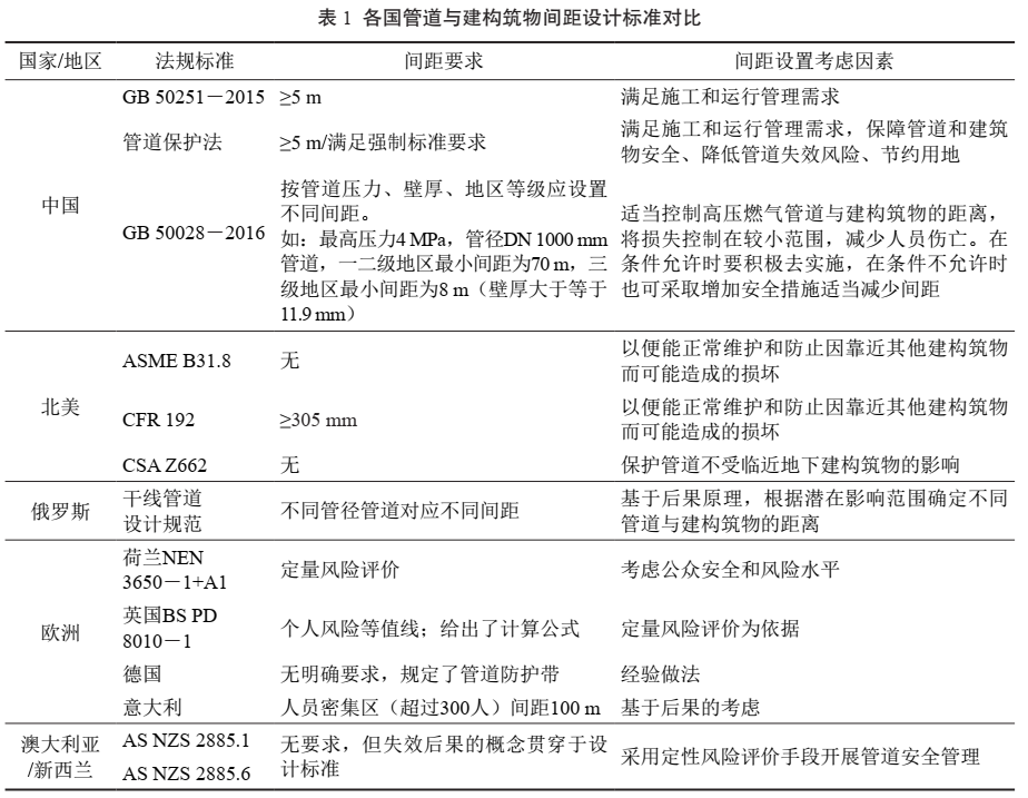 通過對比國內(nèi)外標準,發(fā)現(xiàn)不同國家在設計階段對管道與建構筑物的間距要求、間距設置原則、考慮因素等均存在差異,國際上并沒有統(tǒng)一標準。對比主要結果見表 1。