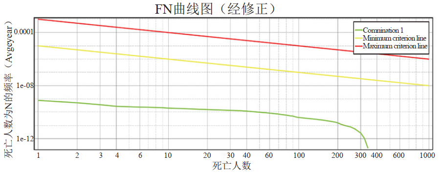 社會風險表示特定防護目標多人死亡的事故累計頻率,也就是群體死亡的頻發(fā)程度。通過兩條風險分界線將社會風險劃分為三個區(qū)域,即:不可接受區(qū)、盡可能降低區(qū)和可接受區(qū),詳見圖 1。