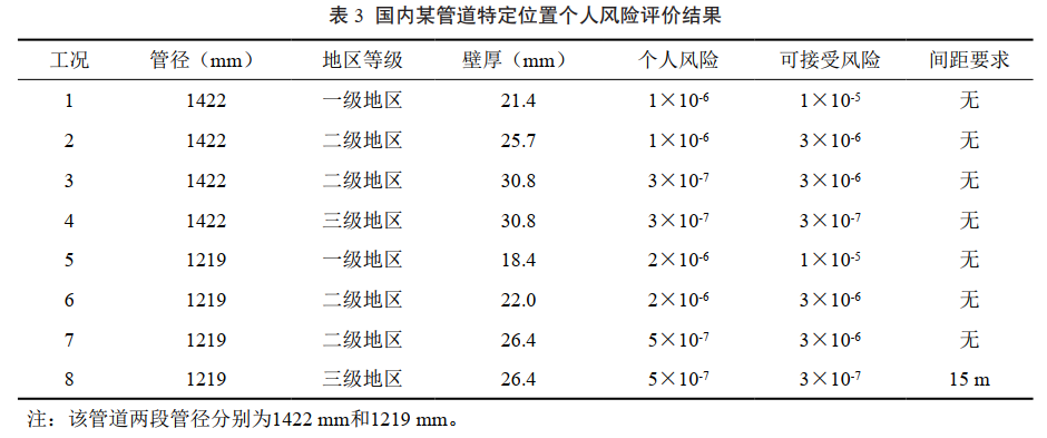 如果個人風險、社會風險或“10人”準則任何一項結果未滿足法規(guī)與標準要求,則管道與建構筑物間距不可接受,需要調(diào)整管道輸送參數(shù)或周邊建筑物分布;反之,三項結果均滿足才能判定油氣管道與建構筑物間距可以接受。