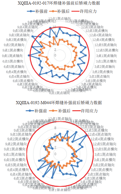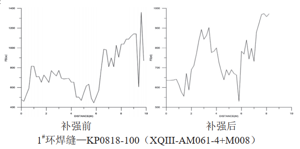 圖 3 環(huán)焊縫補(bǔ)強(qiáng)前后遠(yuǎn)場應(yīng)力檢測結(jié)果示例