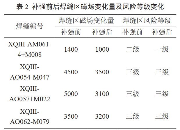 焊縫補(bǔ)強(qiáng)前后焊縫區(qū)磁場變化量及風(fēng)險(xiǎn)等級變化如表 2所示。對于焊縫區(qū)磁場變化量較小、風(fēng)險(xiǎn)等級較低的焊縫,補(bǔ)強(qiáng)后磁場變化量有所降低,表明該處應(yīng)力集中程度有所降低,應(yīng)力風(fēng)險(xiǎn)等級由二級降為一級。但焊縫區(qū)磁場變化量較大、風(fēng)險(xiǎn)等級較高時(shí),盡管補(bǔ)強(qiáng)后磁場變化量有所降低,但應(yīng)力集中程度仍較高,風(fēng)險(xiǎn)等級仍為三級,補(bǔ)強(qiáng)效果有限。