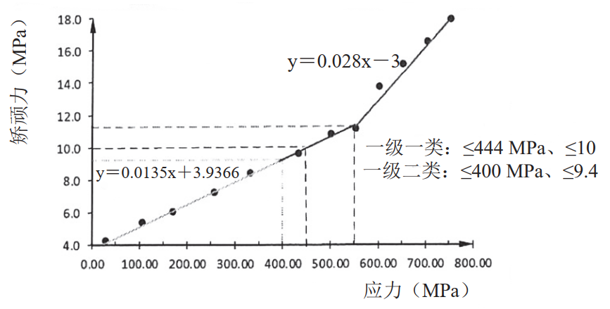 由圖 4可知,對于X80鋼,矯頑力值在0~10范圍內(nèi)時(shí),管體處于安全模式,一級一類地區(qū)最大應(yīng)力不超過444 MPa,對應(yīng)矯頑力值應(yīng)不超過10。當(dāng)矯頑力值在10.0至11.5時(shí),試件處于安全系數(shù)大于1的狀態(tài),最大應(yīng)力不超過555 MPa。當(dāng)矯頑力值大于11.5(小于16.0)時(shí),矯頑力與應(yīng)力關(guān)系曲線斜率變大,鋼材進(jìn)入強(qiáng)化階段,處于危險(xiǎn)狀態(tài)。