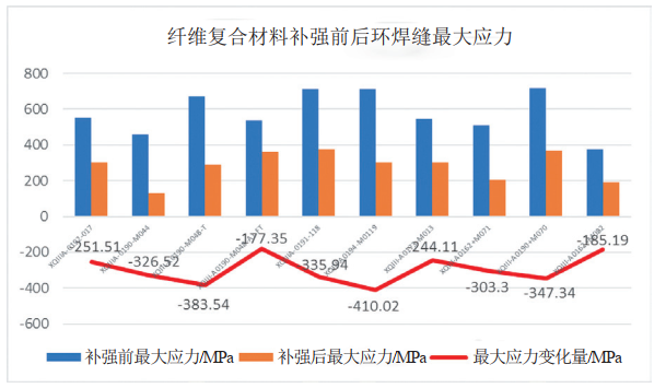 10處環(huán)焊縫纖維復(fù)合材料補(bǔ)強(qiáng)前后最大應(yīng)力統(tǒng)計(jì)結(jié)果及數(shù)據(jù)變化如圖 7所示,補(bǔ)強(qiáng)修復(fù)后各處環(huán)焊縫應(yīng)力明顯降低,且均在許用應(yīng)力值以下,最大應(yīng)力變化值﹣410 MPa~﹣170 MPa。可見,纖維復(fù)合材料補(bǔ)強(qiáng)可有效降低焊縫處最大應(yīng)力,補(bǔ)強(qiáng)效果顯著。
