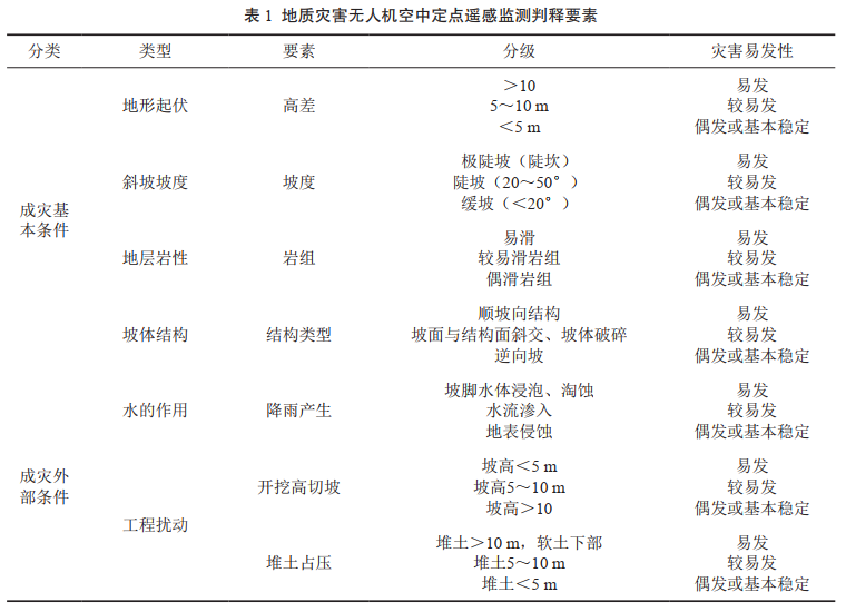 利用多旋翼無人機(jī)進(jìn)行空中定點(diǎn)遙感監(jiān)測(cè),并對(duì)無人機(jī)遙感影像資料進(jìn)行處理,查明管道周邊地質(zhì)環(huán)境是否具備地質(zhì)災(zāi)害的成災(zāi)條件,確認(rèn)工程擾動(dòng)的范圍和強(qiáng)度,是否誘發(fā)地質(zhì)災(zāi)害。在此基礎(chǔ)上,確定隱患問題的類型和發(fā)生條件及對(duì)管道的影響和危害程度(表 1)。