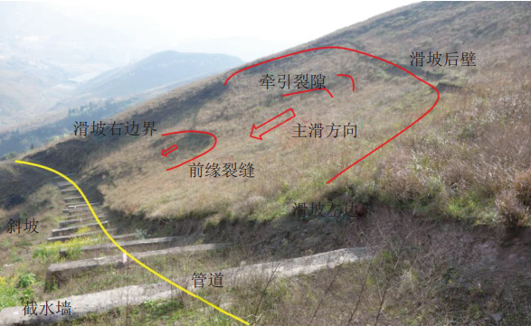 某管道敷設(shè)于桐梓縣貓頭山區(qū)ZY074+500米斜坡變形處,經(jīng)勘探確認(rèn),管道上方斜坡發(fā)育為長(zhǎng)70 m、寬80 m、前后緣最大高差約25 m的淺表層土質(zhì)滑坡。不穩(wěn)定斜坡平均坡度為24°,四周相對(duì)較高,地貌上為淺型凹地,具有較好的匯水條件。斜坡體表面堆積層覆蓋,結(jié)構(gòu)松散,基巖結(jié)構(gòu)面與斜坡坡面斜交。