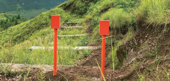 受災(zāi)段管道安裝3組管道軸向應(yīng)力監(jiān)測(cè)截面(X1、X2、X3)、2套管道地質(zhì)災(zāi)害野外監(jiān)測(cè)樁(圖 6,用于數(shù)據(jù)回傳),其中 X1監(jiān)測(cè)截面在23和24道擋墻之間,X2在18和19道擋墻之間變形最為強(qiáng)烈位置,X3在15和16道擋墻之間。如圖 7所示。