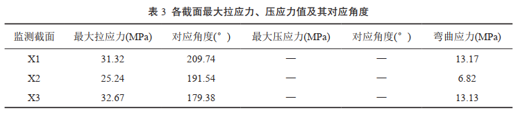 如圖 3所示,在管道外壁A、B、C 3個(gè)監(jiān)測(cè)點(diǎn)安裝應(yīng)變計(jì)測(cè)量各點(diǎn)應(yīng)變值,即可計(jì)算管道截面內(nèi)任意點(diǎn)的應(yīng)變值大小,由胡克定律,計(jì)算得到監(jiān)測(cè)截面的最大應(yīng)力值。據(jù)此可長(zhǎng)期監(jiān)測(cè)管道截面實(shí)時(shí)應(yīng)力大小及變化趨勢(shì)。按照QSY 1672―2014《管道滑坡災(zāi)害監(jiān)測(cè)規(guī)范》,將管道地質(zhì)災(zāi)害風(fēng)險(xiǎn)分為藍(lán)色、黃色、紅色三個(gè)等級(jí)預(yù)警,對(duì)應(yīng)的管道附加應(yīng)力達(dá)到管道拉(壓)應(yīng)力允許值分別為30%、60%、90%。